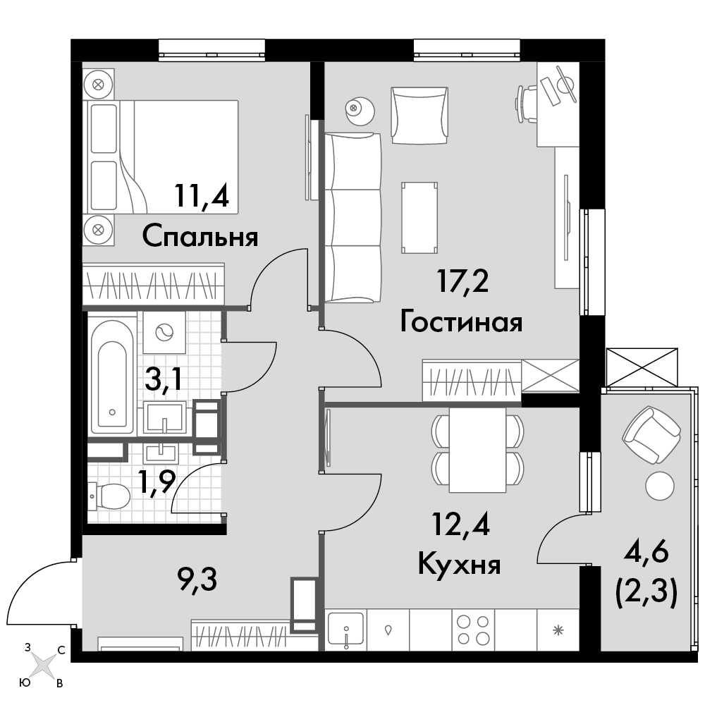 2-комнатная квартира № 116, 57.60 м2 без отделки 20 эт.