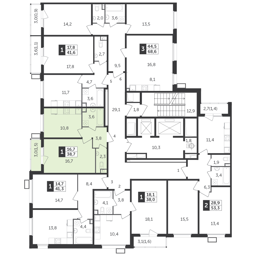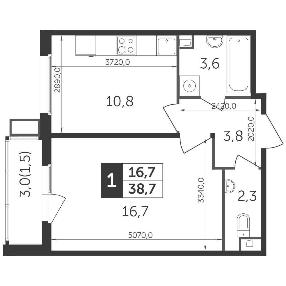 1-комнатная квартира № 306, 38.50 м2 white-box 18 эт.