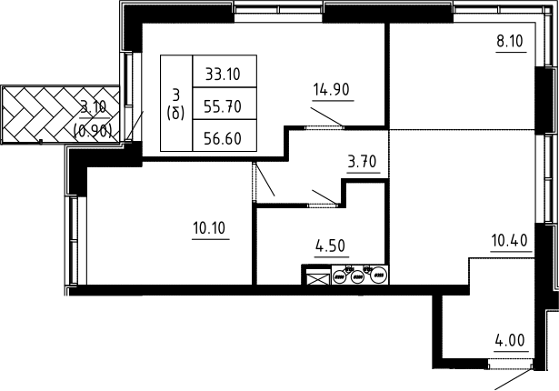 3-комнатная квартира № 99, 55.70 м2 без отделки 12 эт.