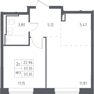 2-комнатная квартира № 91, 37.35 м2 с отделкой 13 эт.