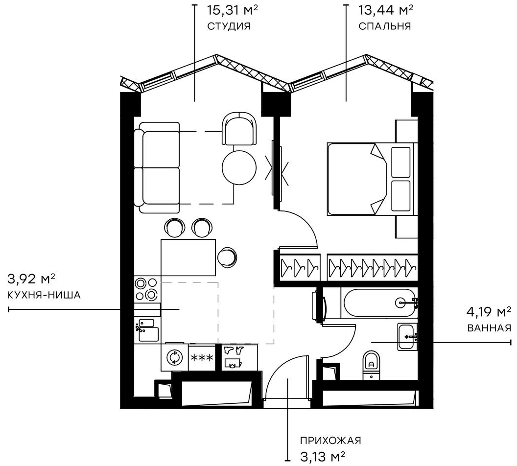 2-комнатная квартира № 48, 39.99 м2 с отделкой 7 эт.