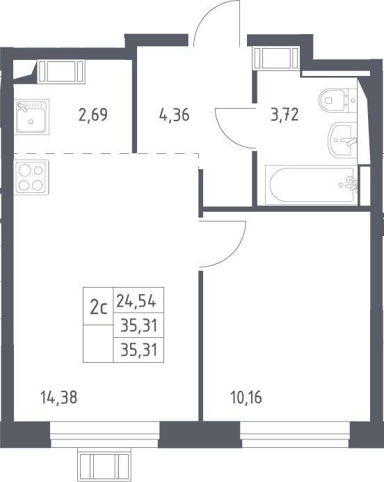 2-комнатная квартира № 19, 35.31 м2 с отделкой 3 эт.