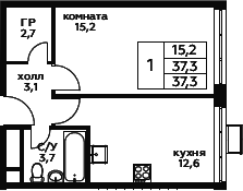 1-комнатная квартира № 346, 37.30 м2 без отделки 17 эт.