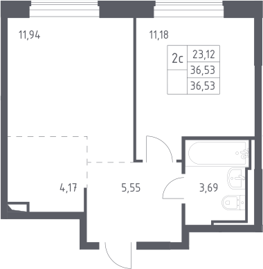 2-комнатная квартира № 282, 36.53 м2 с отделкой 3 эт.