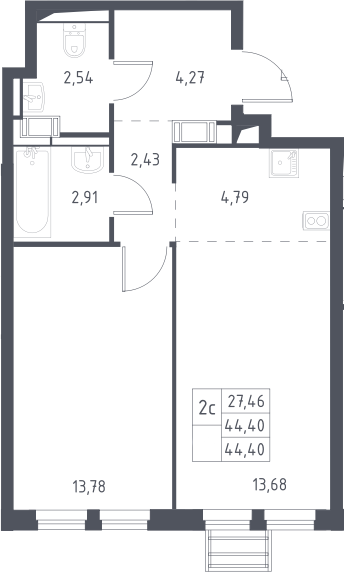 2-комнатная квартира № 61, 44.40 м2 с отделкой 7 эт.