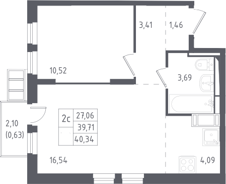2-комнатная квартира № 14, 39.71 м2 с отделкой 3 эт.