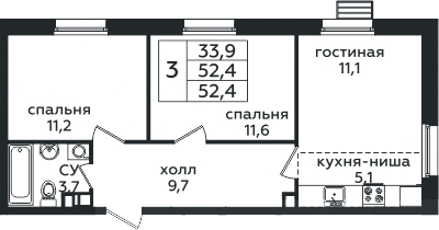 3-комнатная квартира № 694, 52.40 м2 с отделкой 1 эт.