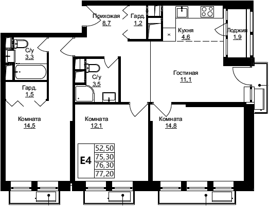 4-комнатная квартира № 18, 75.30 м2 без отделки 3 эт.