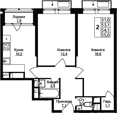 2-комнатная квартира № 23, 53.05 м2 без отделки 3 эт.