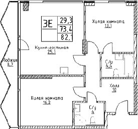 3-комнатная квартира № 250, 73.40 м2 без отделки 14 эт.