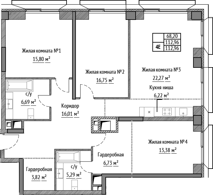 4-комнатная квартира № 500, 112.96 м2 без отделки 12 эт.