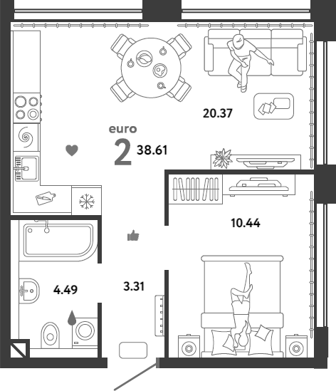 2-комнатная квартира № 530, 38.61 м2 с отделкой 5 эт.