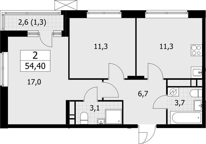 2-комнатная квартира № 432, 53.10 м2 без отделки 12 эт.