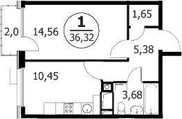 1-комнатная квартира № 19, 35.72 м2 с отделкой 3 эт.