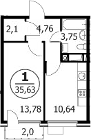 1-комнатная квартира № 50, 35.03 м2 с отделкой 1 эт.