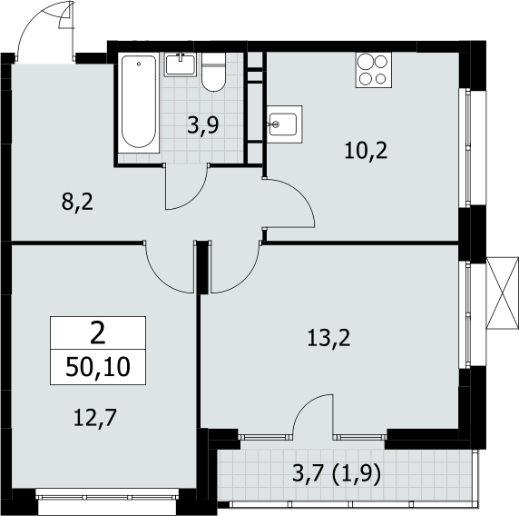 2-комнатная квартира № 193, 48.20 м2 с отделкой 10 эт.