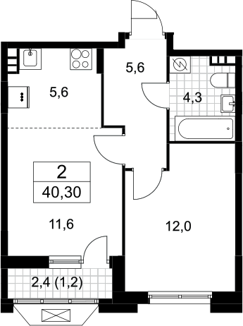 2-комнатная квартира № 520, 39.10 м2 без отделки 4 эт.