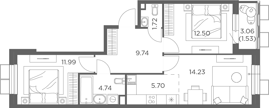 3-комнатная квартира № 415, 60.62 м2 без отделки 10 эт.
