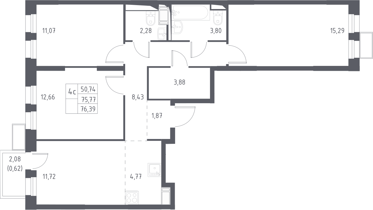 4-комнатная квартира № 44, 75.77 м2 с отделкой 8 эт.
