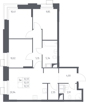 4-комнатная квартира № 46, 72.17 м2 без отделки 5 эт.