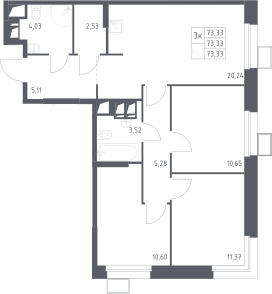 3-комнатная квартира № 222, 73.33 м2 с отделкой 13 эт.
