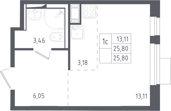 Студия № 872, 25.80 м2 с отделкой 8 эт.