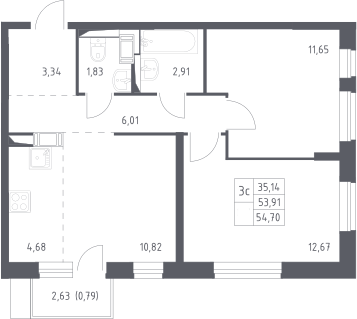 3-комнатная квартира № 62, 53.91 м2 с отделкой 7 эт.