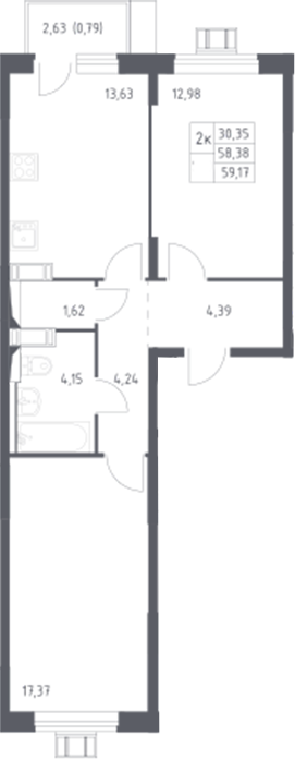 2-комнатная квартира № 222, 58.38 м2 с отделкой 5 эт.