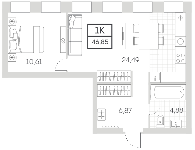 2-комнатная квартира № 717, 46.85 м2 с отделкой 6 эт.