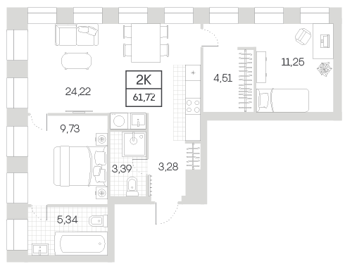 3-комнатная квартира № 756, 61.72 м2 с отделкой 11 эт.