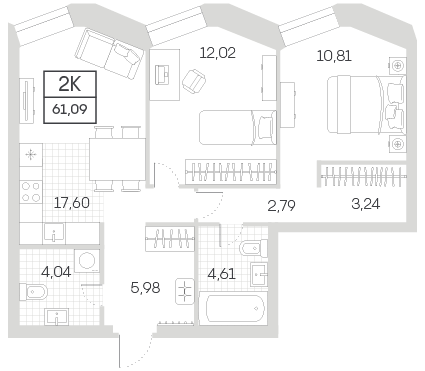 3-комнатная квартира № 765, 61.09 м2 с отделкой 11 эт.