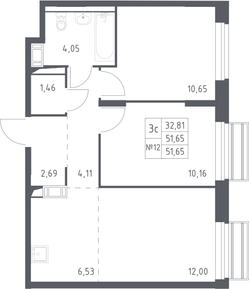 3-комнатная квартира № 70, 51.65 м2 с отделкой 6 эт.