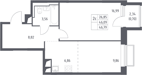 2-комнатная квартира № 15, 46.09 м2 с отделкой 3 эт.