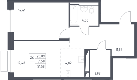 2-комнатная квартира № 191, 51.58 м2 с отделкой 21 эт.