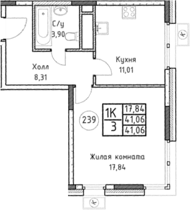 1-комнатная квартира № 239, 41.06 м2 без отделки 11 эт.