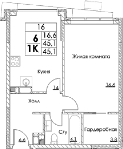 1-комнатная квартира № 16, 45.10 м2 без отделки 3 эт.
