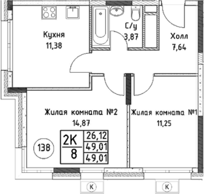 2-комнатная квартира № 138, 49.01 м2 без отделки 12 эт.