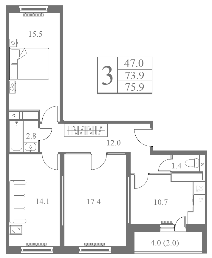 3-комнатная квартира № 85, 73.90 м2 без отделки 6 эт.