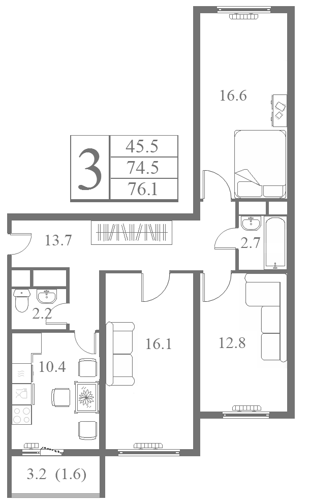 3-комнатная квартира № 64, 74.50 м2 без отделки 6 эт.