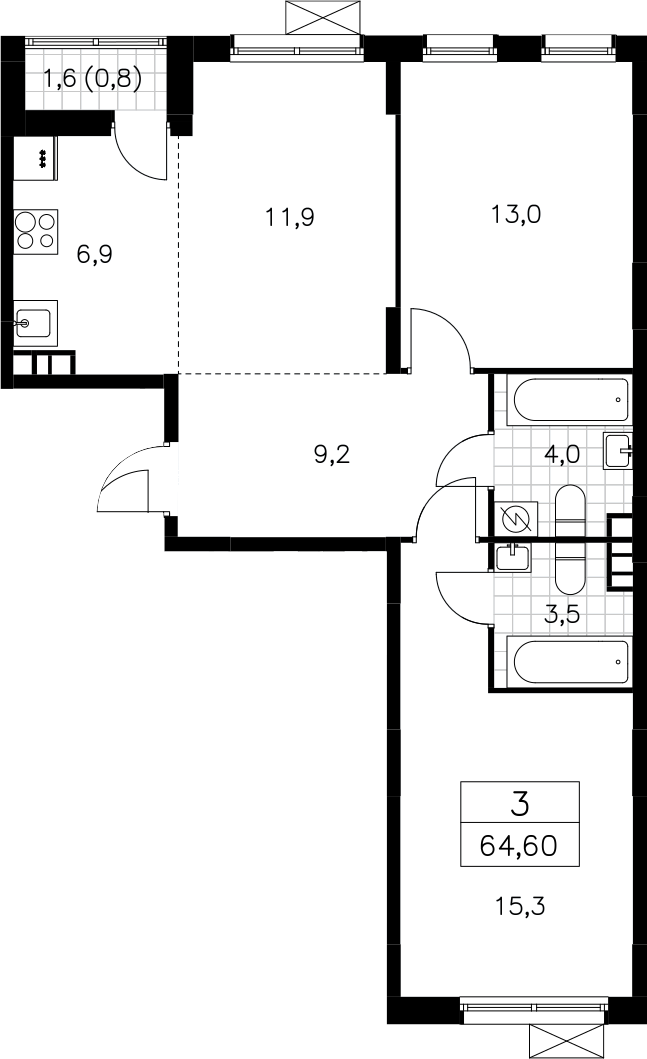 3-комнатная квартира № 247, 63.80 м2 с отделкой 4 эт.