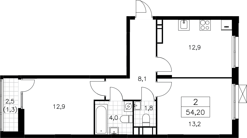 2-комнатная квартира № 359, 52.90 м2 с отделкой 9 эт.