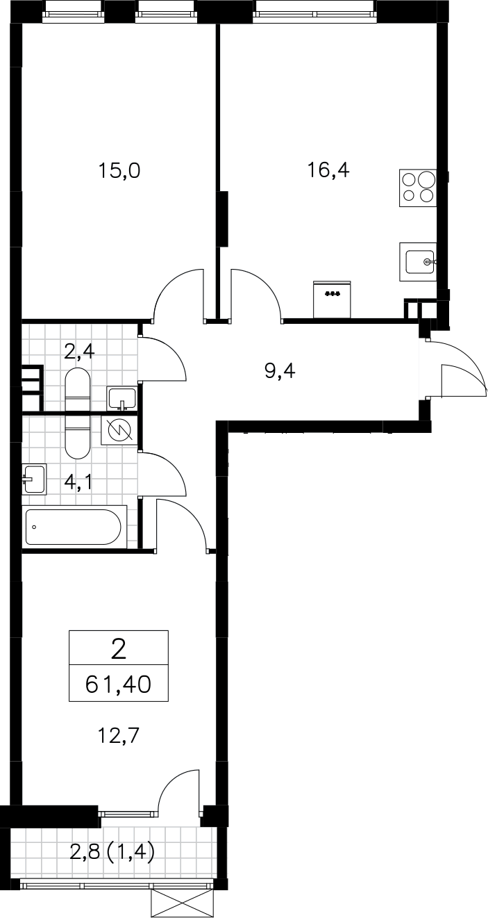 2-комнатная квартира № 588, 60.00 м2 без отделки 3 эт.