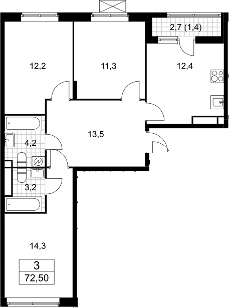 3-комнатная квартира № 184, 71.10 м2 с отделкой 12 эт.