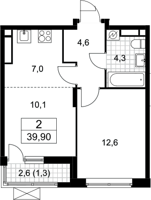 2-комнатная квартира № 198, 38.60 м2 с отделкой 15 эт.