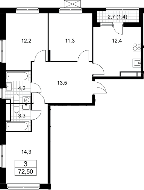 3-комнатная квартира № 194, 71.10 м2 с отделкой 14 эт.