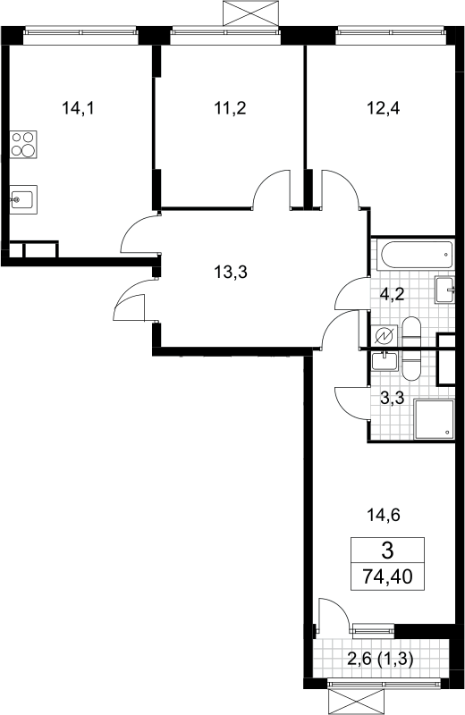 3-комнатная квартира № 315, 73.10 м2 с отделкой 6 эт.