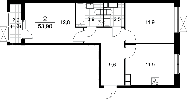 2-комнатная квартира № 423, 52.60 м2 с отделкой 10 эт.