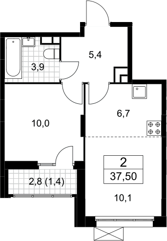 2-комнатная квартира № 34, 36.10 м2 с отделкой 5 эт.