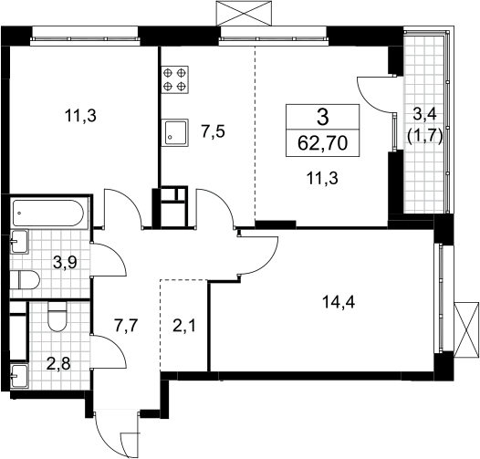 3-комнатная квартира № 66, 61.00 м2 с отделкой 9 эт.