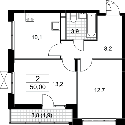 2-комнатная квартира № 199, 48.10 м2 без отделки 9 эт.